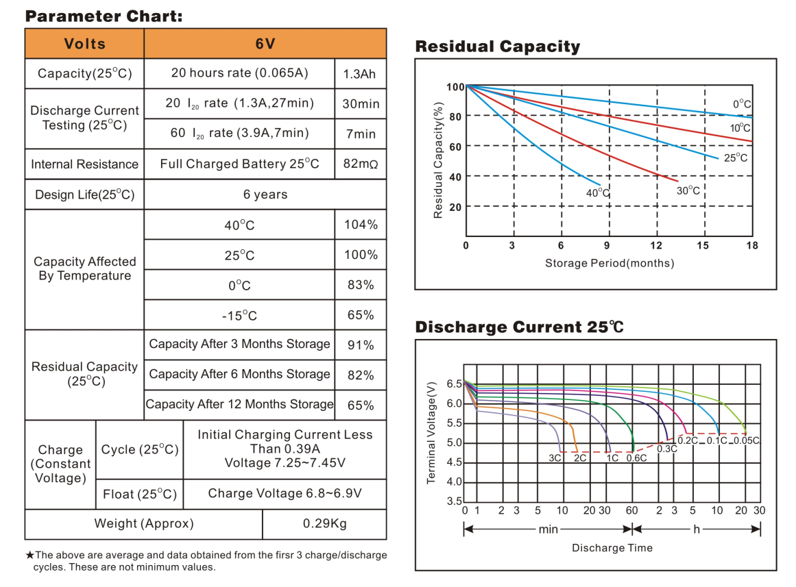 | Dung lượng (25℃) | 20 Hours Rate (1A) | 1.3Ah | ||