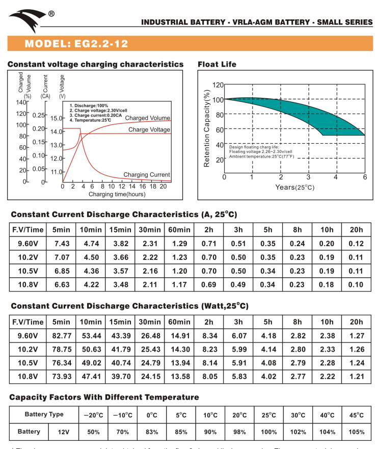 | Dung lượng (25℃) | 20 Hours Rate (1A) | 2.2Ah | ||