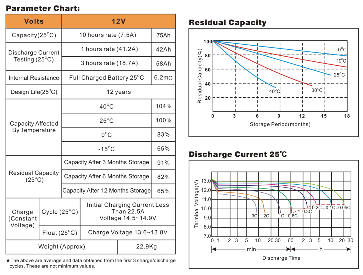 | Dung lượng (25℃) | 20 Hours Rate (1A) | 75Ah | ||